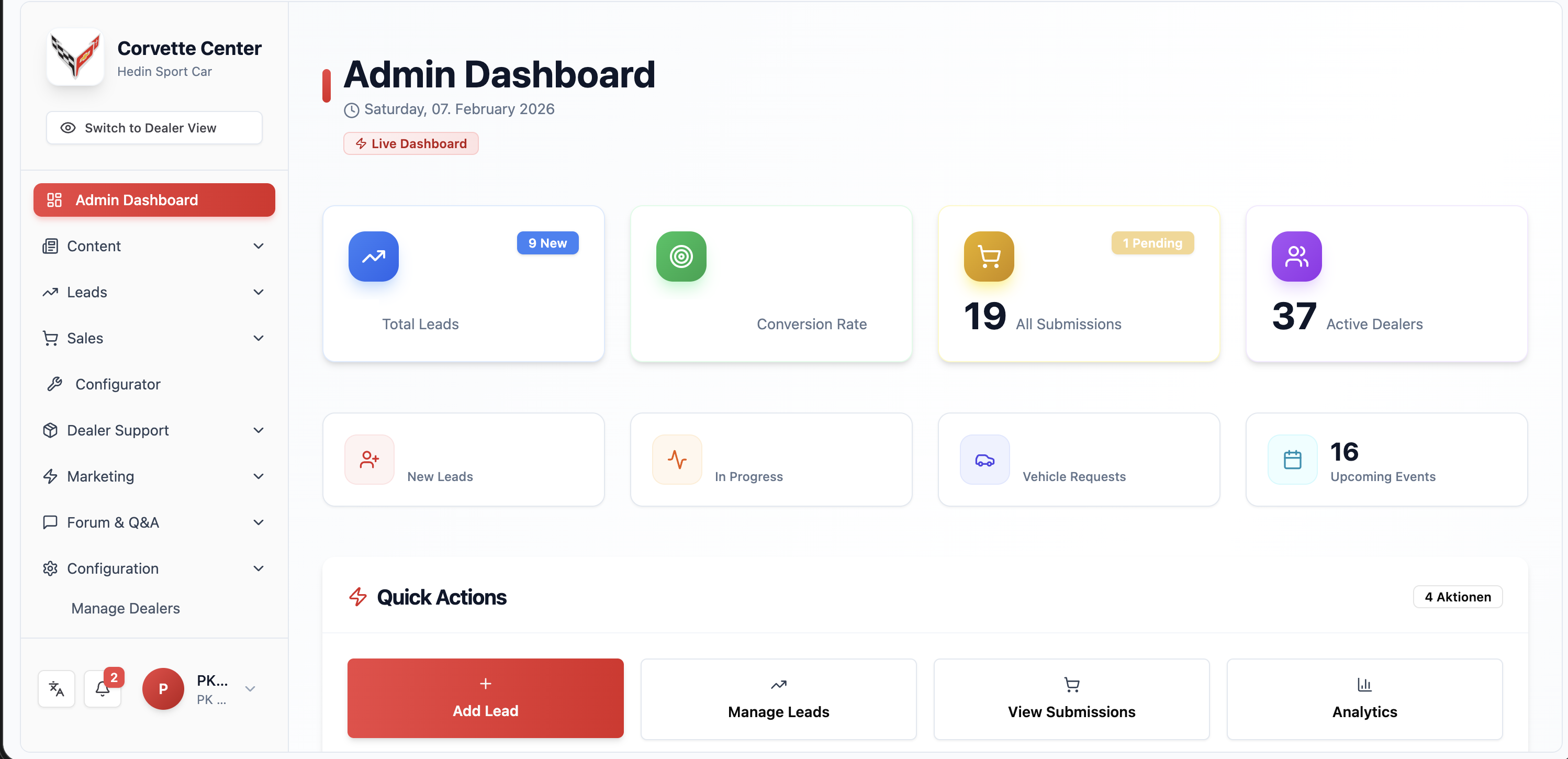 Architektur: React.js und Tailwind CSS im Frontend, Base44 Platform im Backend, Cloud-Deployment mit automatischen Backups. Rollenbasierte Zugriffskontrolle und OTP-Authentifizierung, REST API und Webhooks für Anbindungen (z. B. Website, GM). Lead-Management: Händler sehen zugewiesene Leads mit Filter nach Status, Priorität und Datum; detaillierte Lead-Profile, Aktivitätshistorie, Status-Workflow von New bis Won/Lost. Admins steuern die zentrale Lead-Übersicht, automatische Verteilung nach Region/Verfügbarkeit, Webhook-API, Eskalation (48h Warnung, 7 Tage kritisch), Bulk-Import per Excel und Lead-Analytics mit Conversion und Response-Zeiten. Sales: Customer Order Intake, Demo Support Request, Monthly Reports (Leads, Test Drives, Orders, Stock), Warranty Activation, Leasing/Trade-In, Vehicle Registration Bonus – mit Submission-Verwaltung, Dokumenten-Management und KPI-Dashboard. Weitere Module: HSC Stock Management (Lagerfahrzeuge, Reservierungen, Inquiry-Tracking), Konfigurator mit Preiskalkulation, Marketing (Events, Vehicle Requests, Newsletter, Marketing Hub), Aftersales (Warranty Claims, Parts, Service, Technical Support), Merchandise, Forum mit KI-Chatbot, News, Dealer Information, Guidelines und Dokumentation. Mehrsprachig (DE/EN/SE), Audit-Trails, Soft-Delete, Backup – die digitale Backbone des europäischen Corvette-Geschäfts.